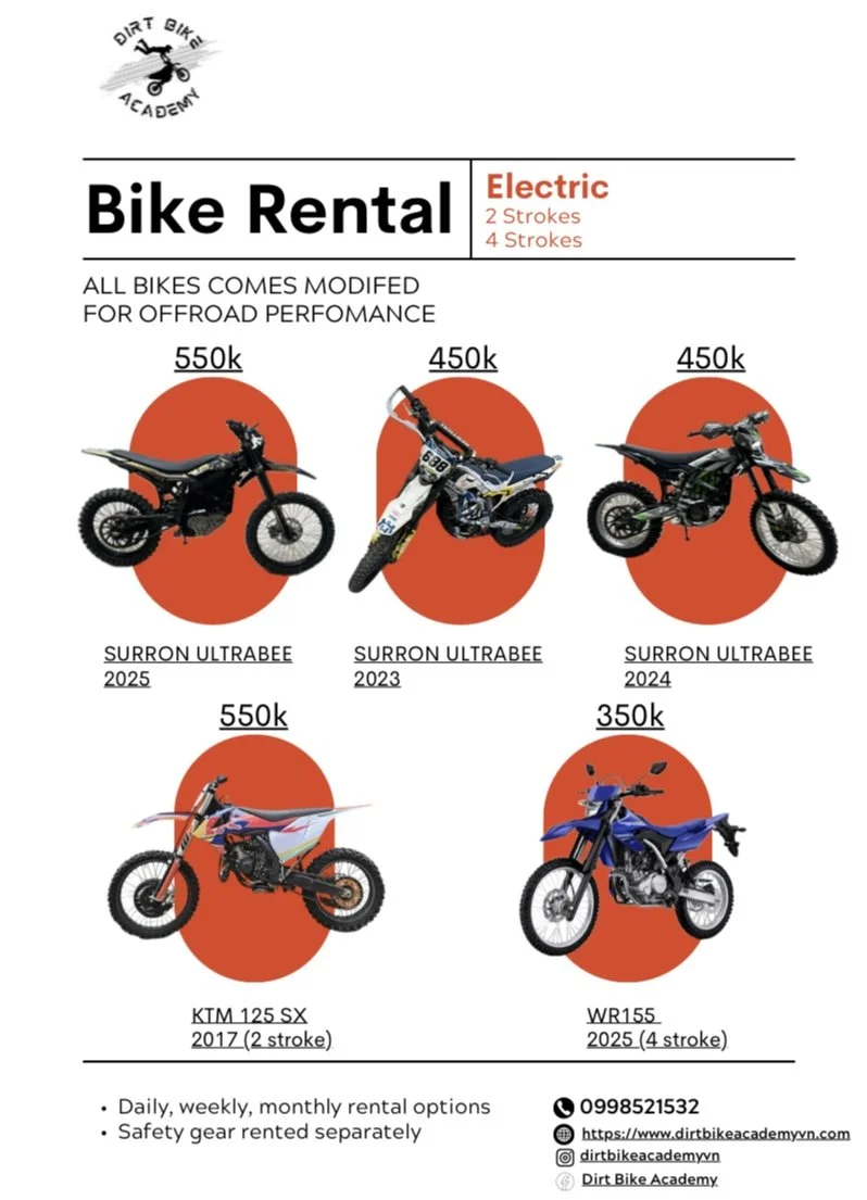 dirt bike academy: have a look at our store Categories: All Merch Lesson Tour Bike Rental Store All | Merch | Lesson | Tour | Bike Rental | Hanoi Loop: Half Day Tour US$60.00 BOOK NOW! Added! Manual Motorbike Lesson (No Off-Road) US$30.00 BOOK NOW! Added! Track ride US$2.00 Book Now! Added! Off Road Lesson: Rent a Bike & Gear US$50.00 BOOK NOW! Added! SOC SON SURRON TOUR (Half a Day) US$100.00 BOOK NOW! Added! One Day Off-Road Tour: Hanoi US$150.00 BOOK NOW! Added! 4 Day Vietnam Off Road Tour: North West US$175.00 BOOK NOW! Added! Off-Road Lesson: Bring Your Own Bike & Gear US$30.00 BOOK NOW! Added! Scooter lesson Sale Price: US$25.00 Original Price: US$30.00 Sale Book Now! Added! SURRON ULTRA BEE US$20.00 ENJOY THE RIDE NOW Added! KTM SX 125 2017 Sale Price: US$30.00 Original Price: US$40.00 Sale ENJOY THE RIDE NOW Added! KTM 85CC Sale Price: US$20.00 Original Price: US$25.00 Sale ENJOY THE RIDE NOW Added! Dirt Bike Academy Jersey US$20.00 Add To Cart Added!